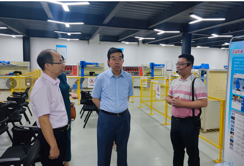 黄震一行来到我校打造的集教学、科研、对外技术服务于一体的东莞市机器人技术服务平台,实地参观了展台、FANUC机器人实训区、ABB机器人实训区、KUKA机器人实训区、机器人装调实训区。“有跟其他公司合作吗?有无吸引到企业的一些投资?”“对外培训周期多长?是否考取相关的职业技能等级证书?”认真听取相关人员的汇报后,黄震一行就对外培训、职业技能考证、企业合作进行了详细询问。得知我校机器人技术服务平台与华数、ABB机器人(中国)有限公司、广东省智能机器人研究院都开展了合作,同时基地承担对外培训,组织考取技能等级证书,还帮助学员推荐就业,黄震表示“这种模式非常好”,对基地的运营模式和发展方向给与充分肯定,希望继续发挥平台优势,为行业提供更高质量的人才。