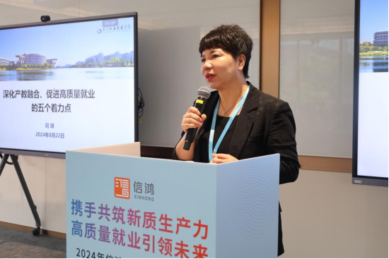 主题研讨环节,我校党委书记司琪作为院校代表作“深化产教融合、促进高质量就业的五个着力点”的主题发言,她分别从“产教融合的目标指向、产教融合的制度机制、产教融合的重要纽带、产教融合的实现载体、产教融合的最后一公里”分享了我校的经验与做法,受到了与会代表的一致认可。